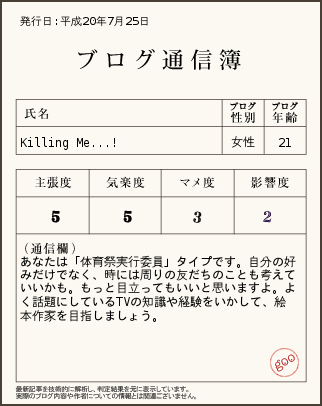 暑さに激弱な道民は26℃でも限界です。 どーもまめです(・∀・) 本州とか南の方は30℃超えてんですよね…。 ゆきひろ先生が生きてるか心配(´Д`)← って言うか、メンバーはけんちゃん以外は夏死んでそう…。 不健康なオーラ出過ぎですよ、ラルクさん。笑 昨日とか何回もやったけど出来なかったブログ通信簿!! やっと出来ました~♪ 結果↓ 一言で言うならば、 予想通り!!(^ω^)笑 最近ラルクとかの話ばっかだし、更新もマメじゃないし(改めろ) のんきな事(たまにネガティブ)ばっかつらつら書いてるし、影響与える内容ではないし!! でも「自分の好みだけでなく」って……ラルク以外書けよって事ですか?? 無理でしょう!!笑 そもそもここに来てくれる方はラルクファンが99%だと思うんですが。笑 「もっと目立つ」ってどうすれば良いんでしょうね~? もっと犯罪的に変態になれって事??(間違った方向) 最後が1番気になったんです。 「よく話題にしているTVの知識や経験をいかして、絵本作家を目指しましょう。」 ラルクの絵本でも作れと??(・∀・) あたしの話題をいかしたら、それしか出来ませんが、子供うけしますか?? 第一の犠牲者は産まれてくる我が子で決定ですが、よろしいですか?? 全く、末恐ろしい提案をしてきやがったよ。笑 でもブログお持ちの方は、一度試してみると面白いかも知れません♪笑 ↓ ブログ通信簿 昨日の記事(追記)に、温かいコメント下さった方、拍手押して下さった方、 本当に元気が出て、前向きになりました。 皆さんに心から感謝してます、ありがとうございました!!!! ちょっと感動して一人でうるうるしてました。笑 PR 2008.07.24 Thu 21:45:11